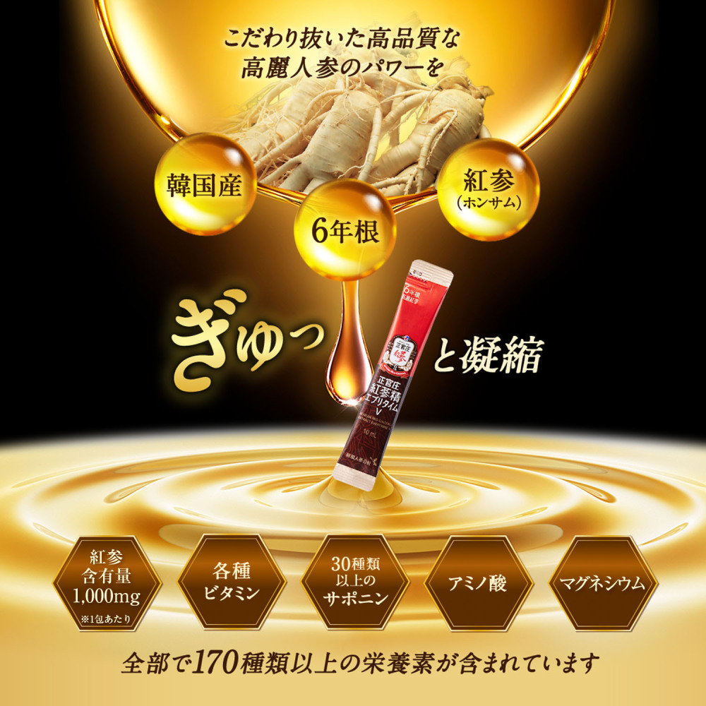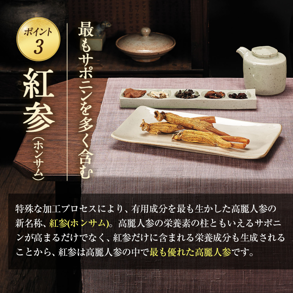 独自の紅参加工法で30種類のサポニンに各種ビタミン・アミノ酸など