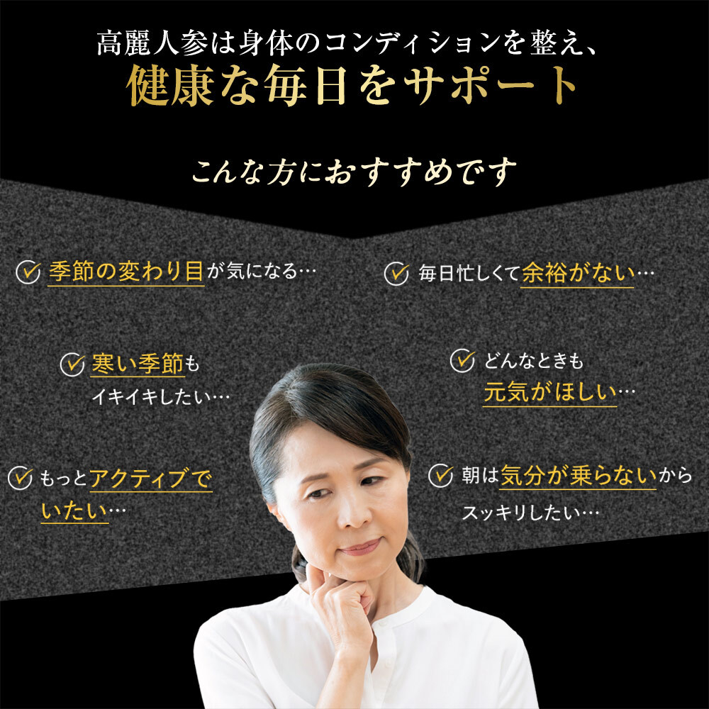 数十年ぶりに対面での接客の仕事を始めたところ、いろいろともらってしまうのか絶えず風邪を引いている状態になり、あまりにツラくすがるような思いでこちらを購入。すると1ヶ月ほどで体調が落ち着き疲れにくくもなりました。以前はめまいや肩こりもひどかったのですがそれもなくなりました。飲み始めて3年半になり、最初の3ヶ月は毎日、それ以降は1日おきに飲んでいますが十分効果はあります。うっかり切らしてしまい10日ほど飲まない期間があったのですが疲労感がひどく、飲み続けていると慣れてしまい有り難みを忘れてしまいますが、この高麗人参に守られているのだと改めて思いました。少しお高いですが、毎日元気に過ごすためにこれからもリピートします。
