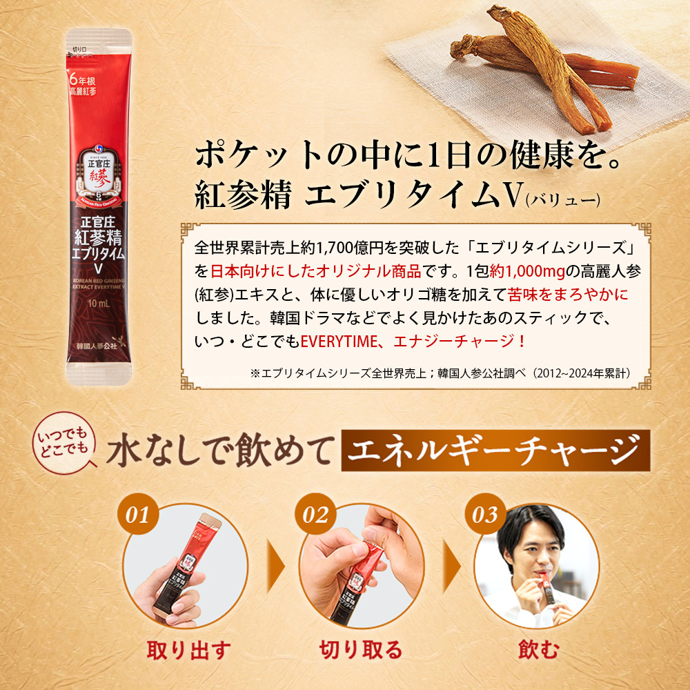 いつもコストコで紅参元50mlを購入し飲んでますが、もう少しステップアップしたくエブリタイムVにチャレンジ。お味は甘い紅参元に比べたらオリゴ糖の存在感ゼロ、だいぶパンチがあります(笑)。私的には、インスタントコーヒーを数滴の水で溶いたかのような苦味で、この量なので気になりません。こうなるとエブリタイムの味も気になるな(*´艸`*)