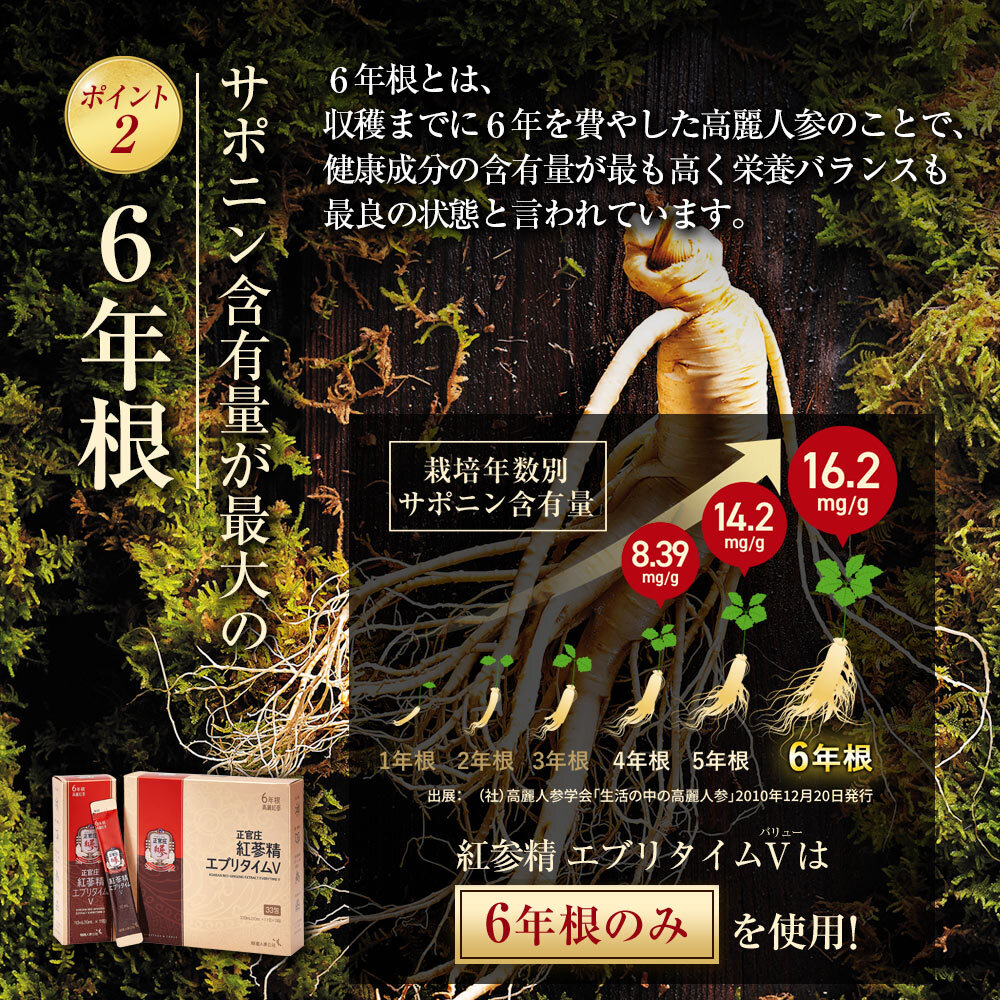 1年根、2年根とサポニンが増えていき、「6年根」がもっとも多くのサポニンを含んでいますので、6年根の製品をお選びください。