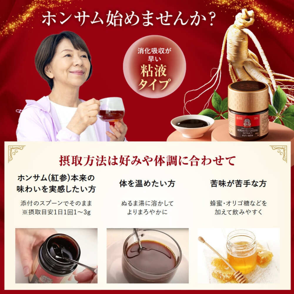 最初はお湯に溶かしていましたが、今はスプーンですくってそのまま飲んでいます。手軽に飲めるし苦さも気になりません。100%紅参というところにとても安心感があります。