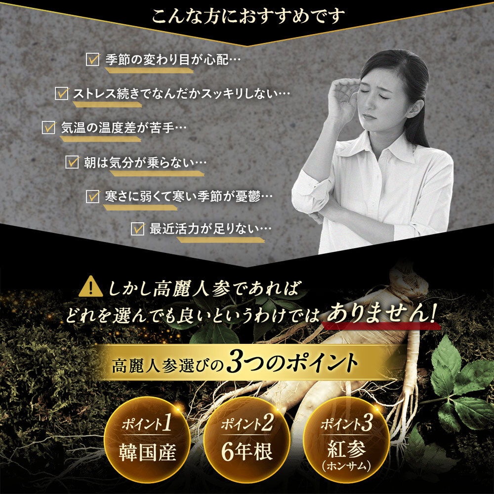 | 成分 | 6年根高麗人参(紅参)粉末100% |